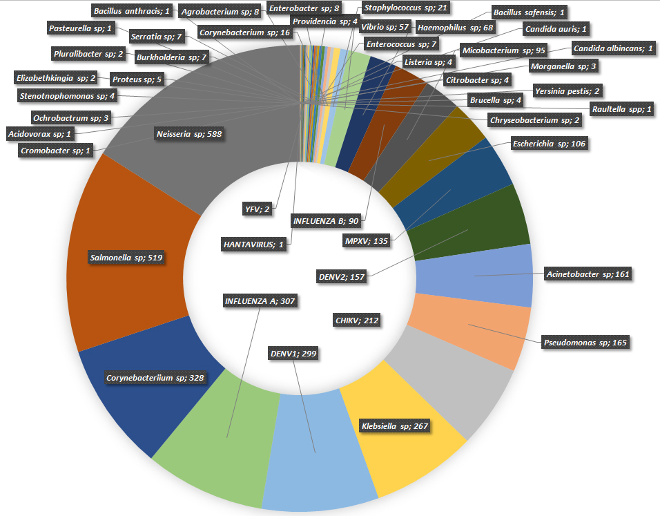 A Vigilância Genômica dos vírus causadores da gripe, da COVID-19, da dengue e da febre Chikungunya, assim como de agentes bacterianos como N. meningitidis, Salmonella Typhi e Vibrio cholerae, tem sido utilizada pelo Laboratório Estratégico para determinar a origem dos patógenos e suas relações e o esclarecimento dos surtos e epidemias, principalmente na tentativa de estabelecer uma correlação entre a virulência e o impacto desses agentes na população. Como exemplo, a vigilância genômica de S. Typhi e V. cholerae é realizada atualmente em tempo real, com a realização do sequenciamento dos genomas completos, para identificar, precocemente, a introdução de novos clones em nossa região. No gráfico abaixo são apresentados os agentes que tiveram genoma completo sequenciado pelo laboratório estratégico, excluindo-se o SARS-CoV-2, com mais de 4.000 sequências obtidas.